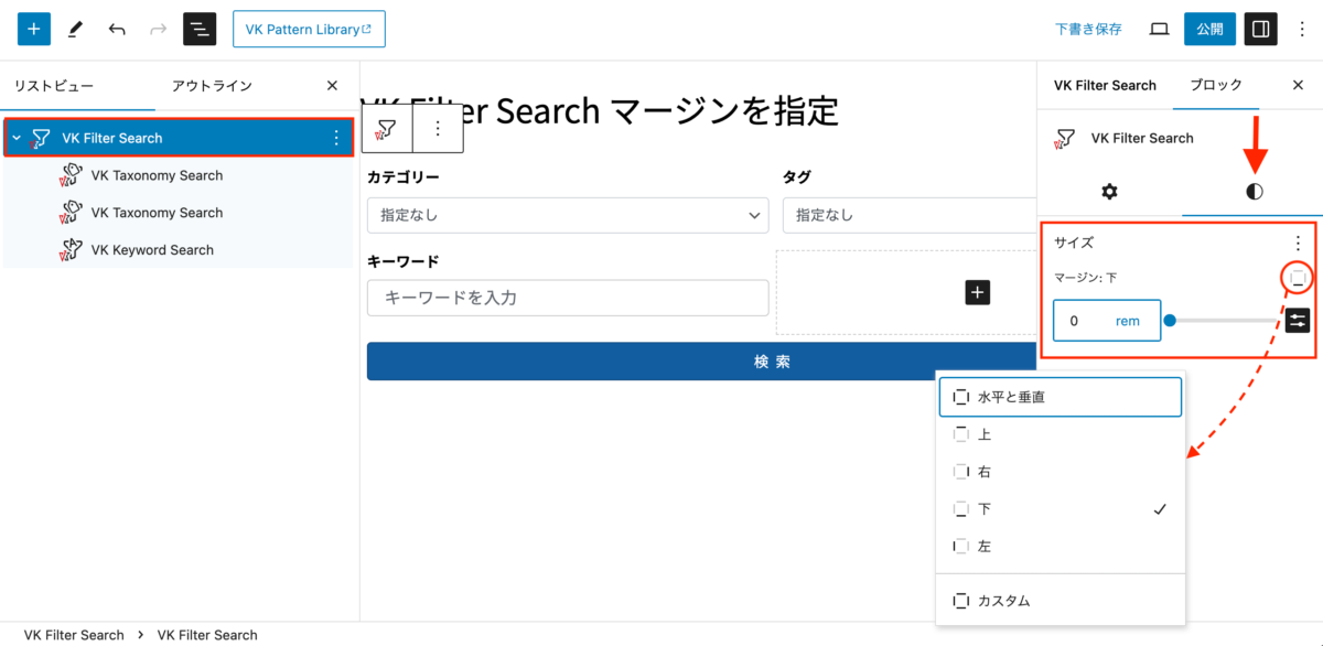 レイアウト設定・装飾は、親の VK Filter Search Pro ブロックを選択した状態で行います。
