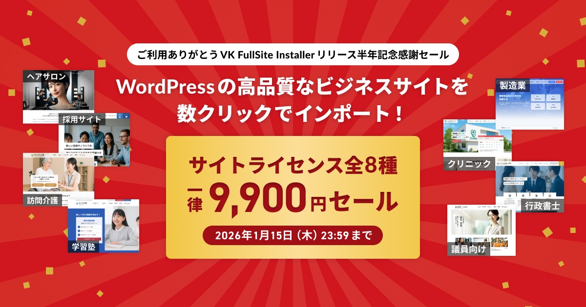そこで、日頃の感謝を込めて、有料版デモサイトのインポートに必要な「VK FullSite Installer 専用サイトライセンス」全8種を一律 9,900円(税込)でご提供するセールを開催いたします。