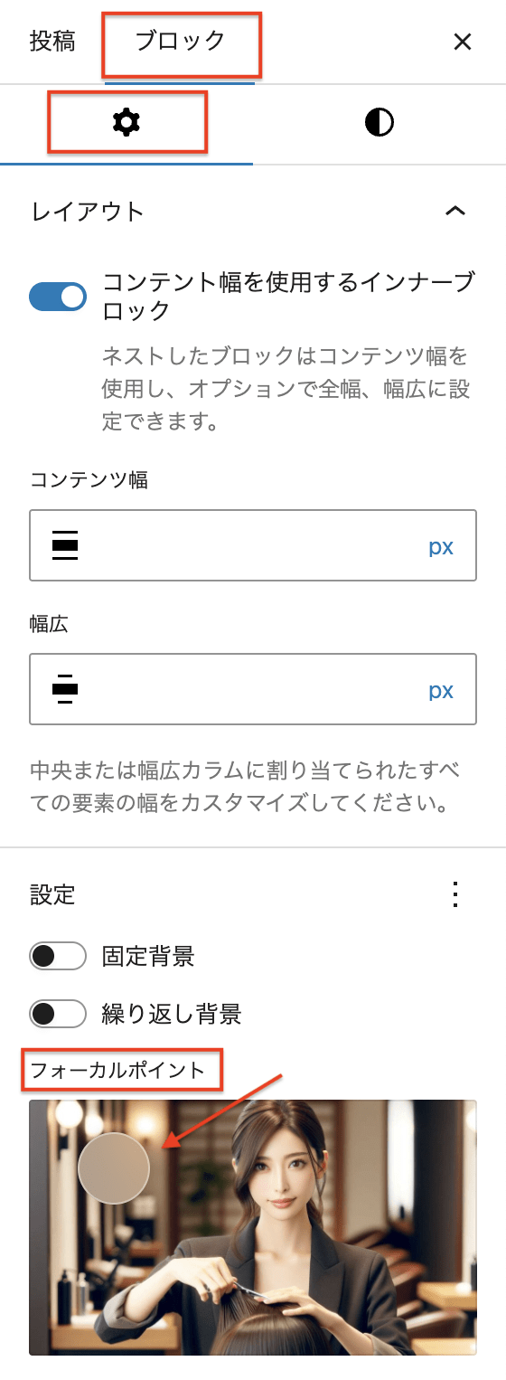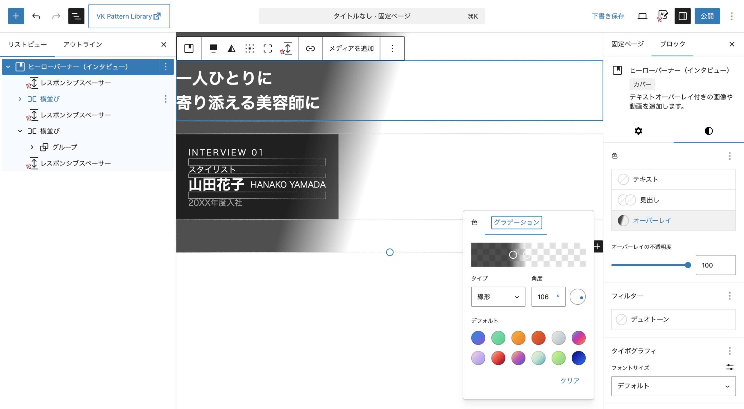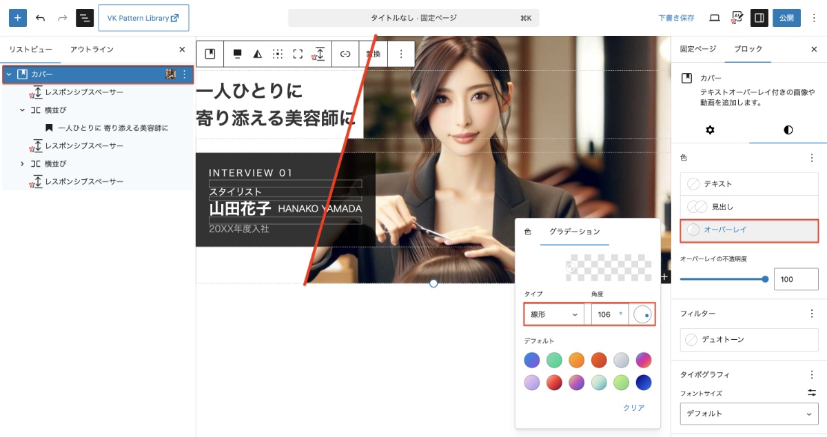 画像の上の文字は見にくくなってしまいますので、まずはカバーブロックの背景オーバーレイで黒をグラデーションさせる事によって視認性が上がるようにします。