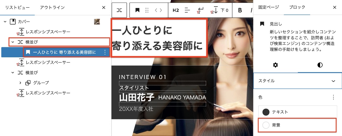 その下の名前が記載してある部分も更に視認性を上げるためにグループブロックで背景に黒の透過を指定します。