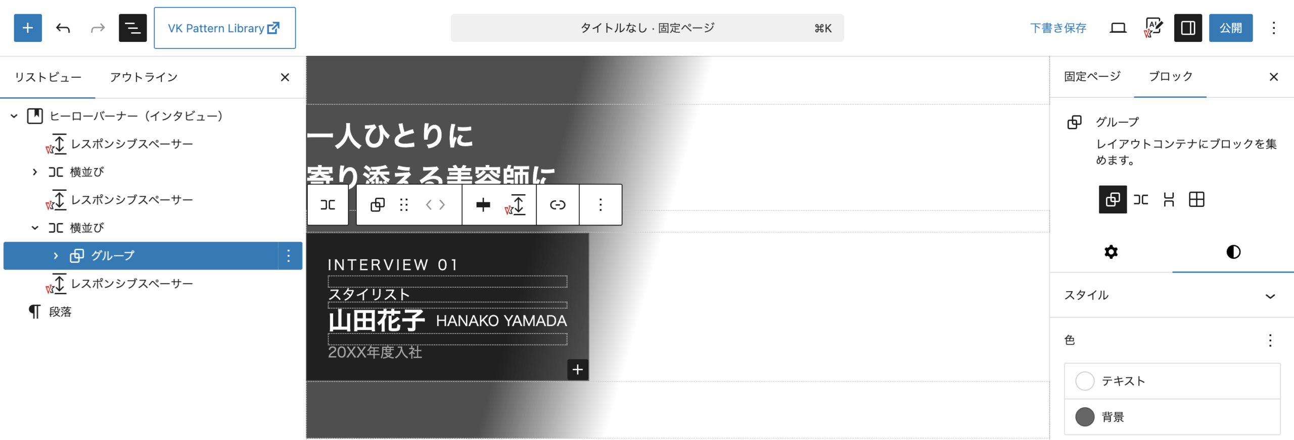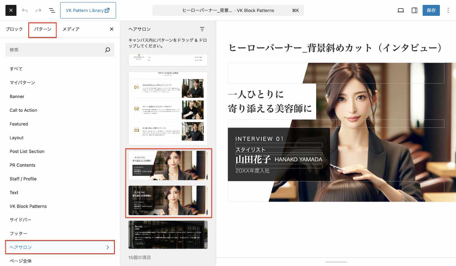 ヘアサロンのデモサイトをインストールしたら、エディタから 「ブロックを挿入 > パターン > ヘアサロン」 から配置する事ができます。