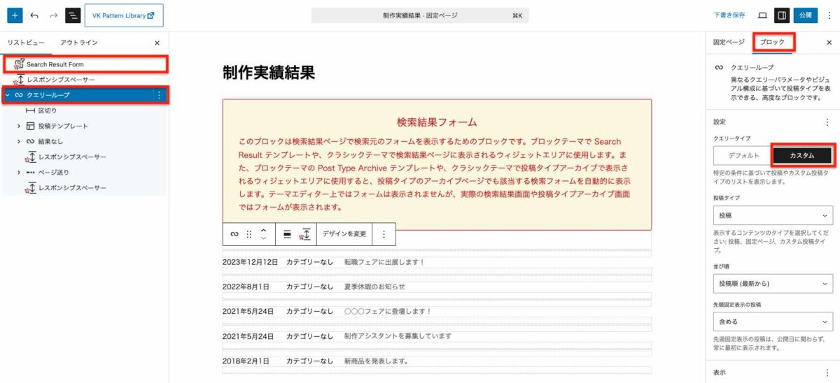 Search Result Form ブロックとクエリーループブロックを配置して「カスタムに設定」