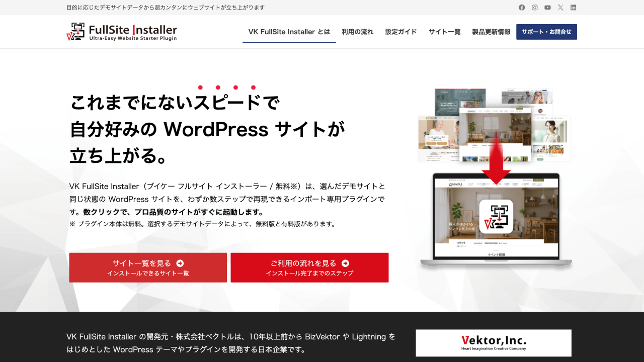 今年5月にリリースした「VK FullSite Installer(VKフルサイトインストーラー)」、もうお試しになりましたか?専用プラグイン(無料)を使えば、選んだデモサイトをまるごとインポートしてすぐに WordPress サイトが立ち上がる…とても便利なサービスです!