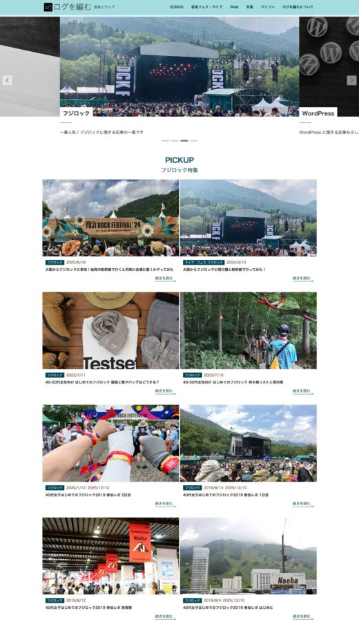 トップのスライダーで目を引くインパクトがありながら、本文部分はシンプル&読みやすさ重視。余計な装飾を抑えた構成。趣味のブログ、地域の魅力を伝えるローカルメディアはもちろん、企業のオウンドメディアにも使えそう。