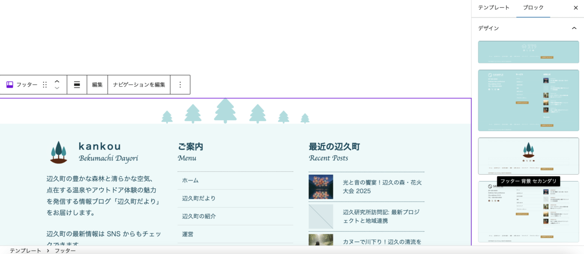 今回は、シンプルなフッターにしたくて、設定サイドバーの「デザイン」から別のデザインに切り替えてみました。