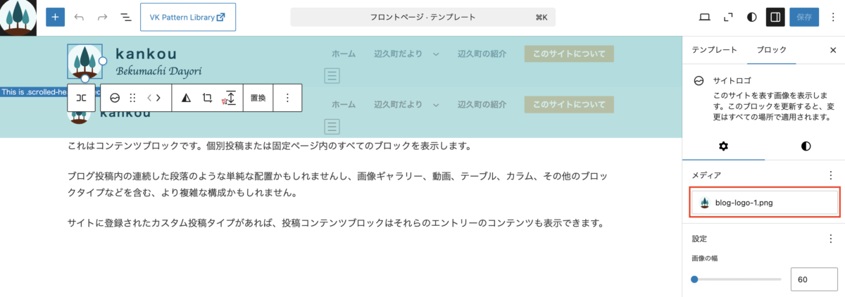 サイトロゴの画像をクリックすると変更でき、幅の調整もできます。