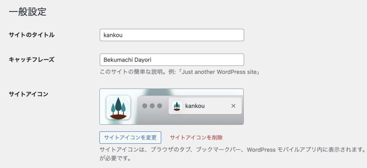 • 設定 > 一般:サイトのタイトルとキャッチフレーズ