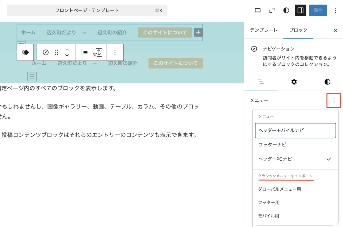 ヘッダーナビはPCとモバイルの2つ設置されているので、モバイルナビのメニューも「クラシックメニューをインポート」で切り替えをお忘れなく。