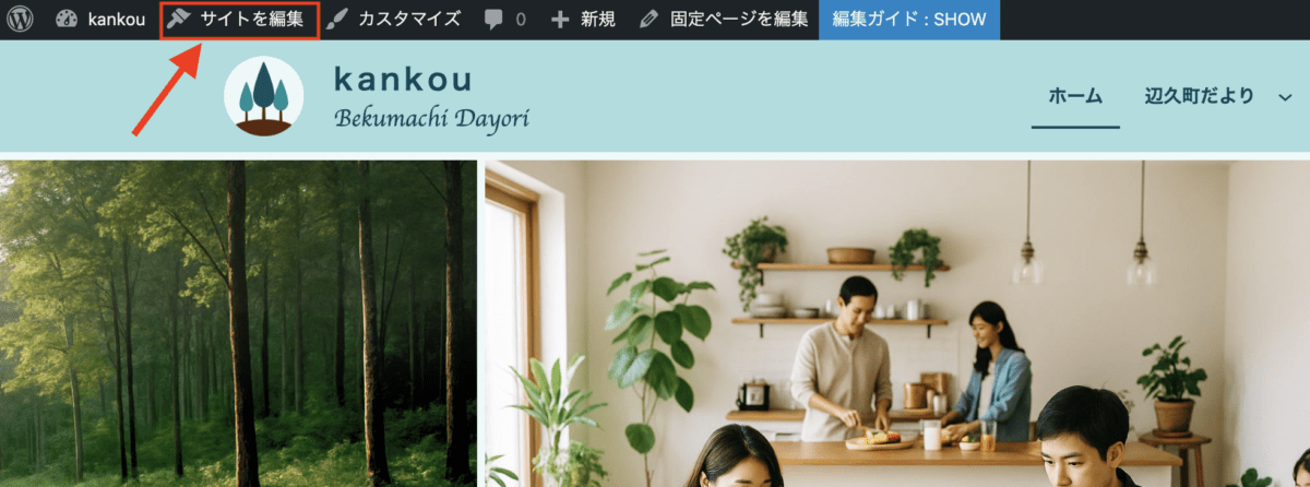 このあとの作業は、フロントページのテンプレート編集画面から行えばやりやすかったです。トップページを開いた状態で「サイトを編集」をクリックすると、フロントページのテンプレート編集画面に入れます。