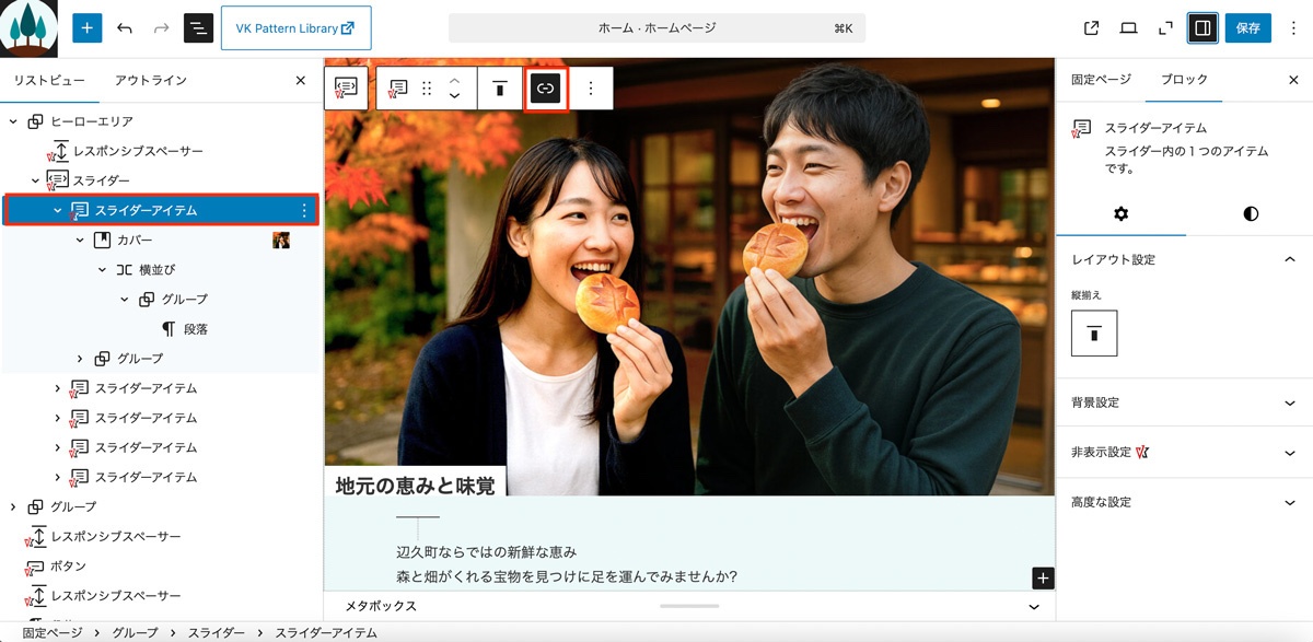スライダーは、VK Blocks のスライダーブロックで作られています。スライダーアイテムの数を減らしたいときはブロックを削除するだけ。リンクの設定は各スライダーアイテムから変更できました。