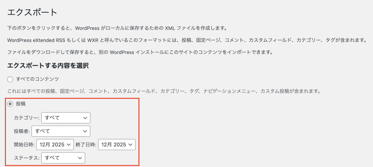 記事を追加したのがちょうど月が変わったタイミングだったので、本番で対象月の投稿のみに絞ってエクスポートし、ステージング環境にインポートしてみました。もちろん、手動でコピペでコンテンツを移してもよいと思います。