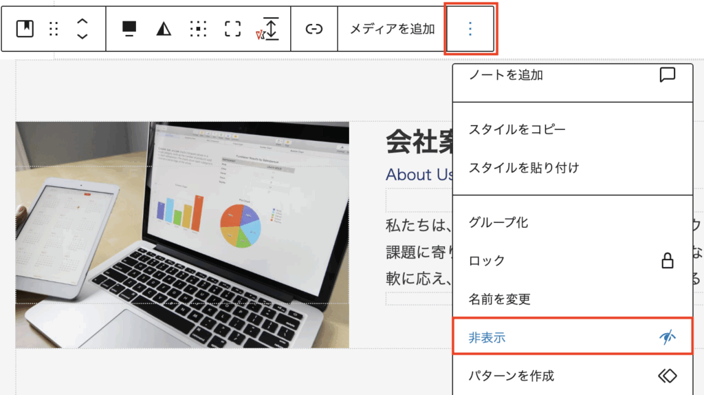 フロント側でブロックを非表示にできる機能が追加されています。非表示にしたブロックは生成されません。そのため、同じページ内に新しいデザインやレイアウトのブロックを配置して非表示にしておき、必要なタイミングで表示させる、未完成のコンテンツをページ内に保存しておく、といったことができそうです。