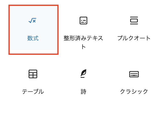 数式ブロックが追加されています。教育コンテンツや技術文書向けに複雑な数式を表示させたい時に便利なようです。必要な方には、別途プラグインを追加しなくてもよくなりそうですね。