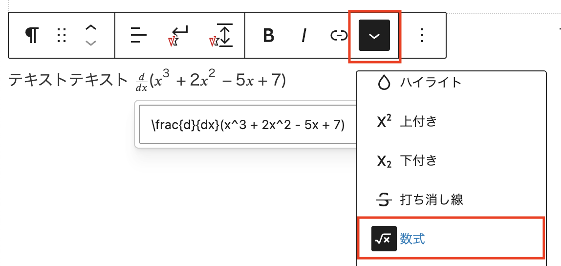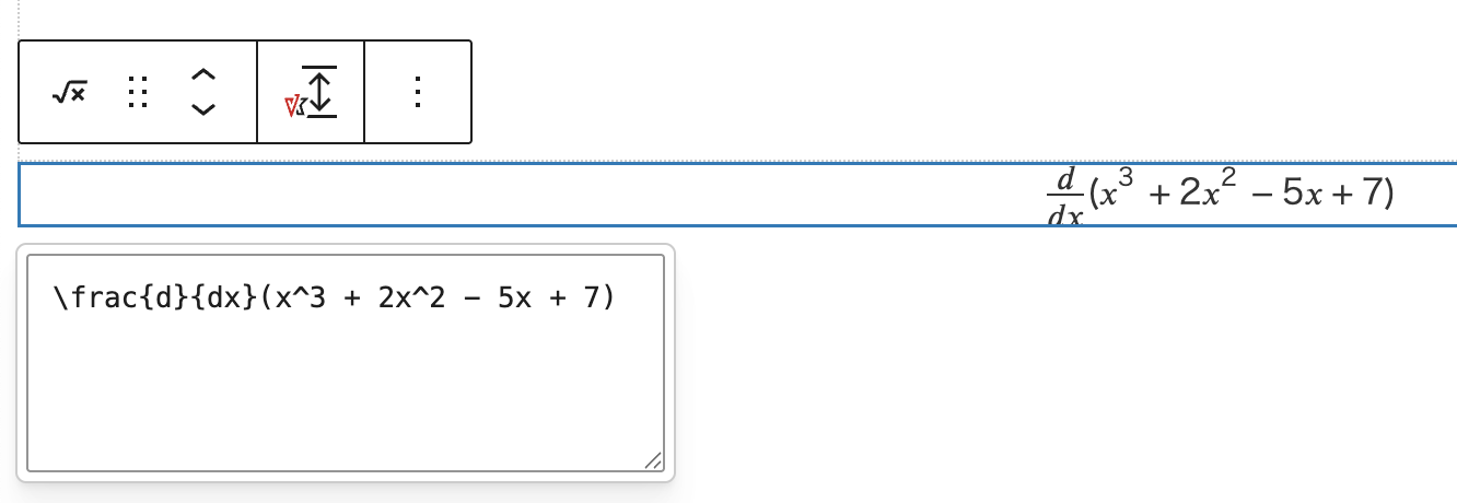 LaTeX 形式の式を入力すると、ブロックに数式が表示されます。