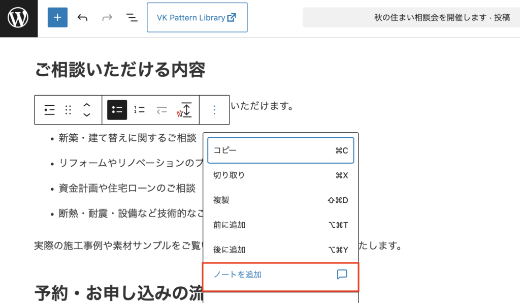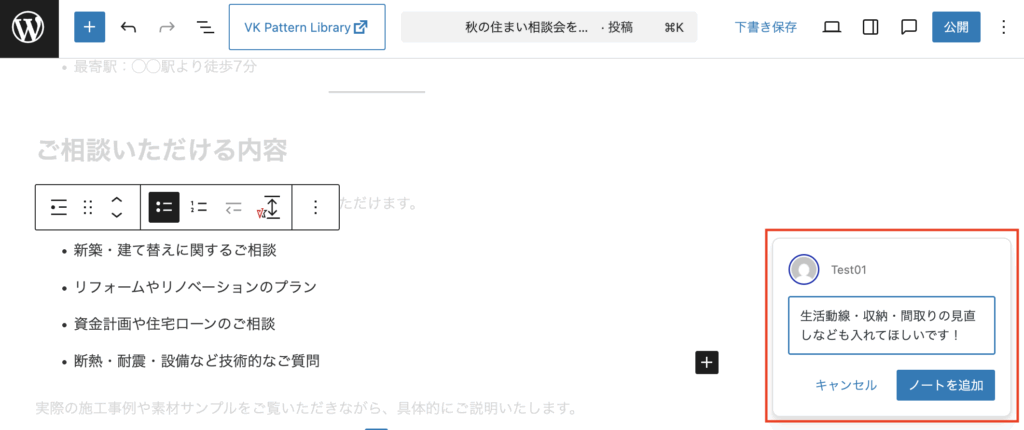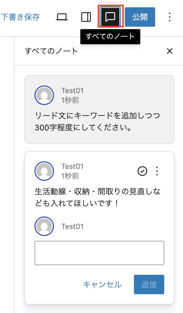 個々のブロックに直接コメントを入力できるようになります。共同作業の場合、コメントのやりとりが編集画面でできるので便利ですね!また、自分用のメモとしても活用できそうです。
