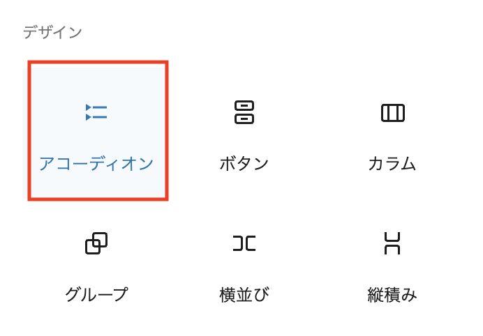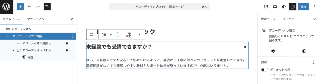 アコーディオンブロックが追加されています。生成されるHTMLを確認するとaria属性がついていて、アクセシビリティにも対応しているようです。