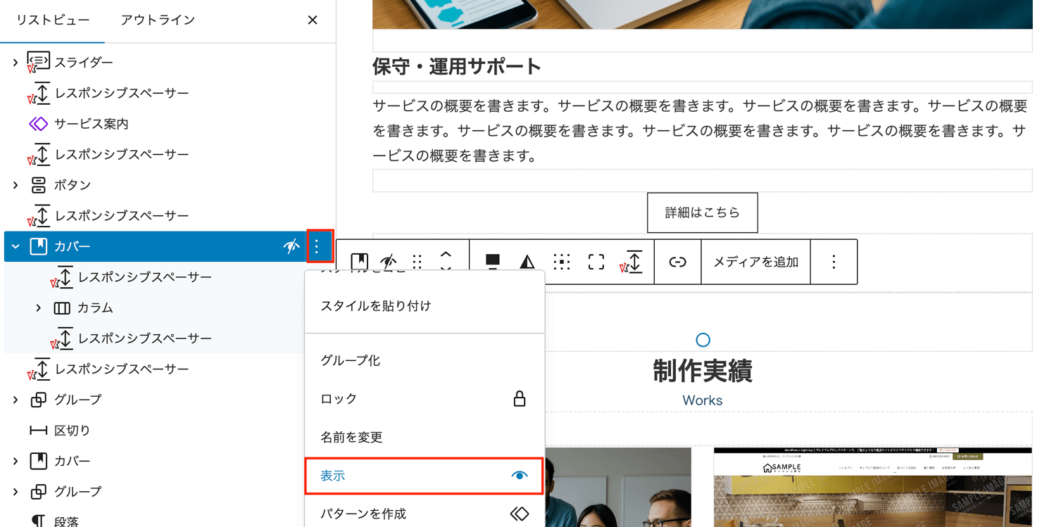 非表示にすると編集画面にも表示されなくなりますが、リストビューには、目に斜線のマークがついたブロックが表示されます。「表示」をクリックすると再び表示されます。