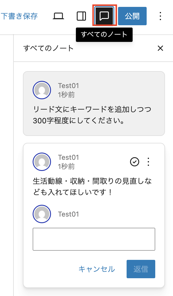 個々のブロックに直接コメントを入力できるようになります。共同作業の場合、コメントのやりとりが編集画面でできるので便利ですね!また、自分用のメモとしても活用できそうです。
