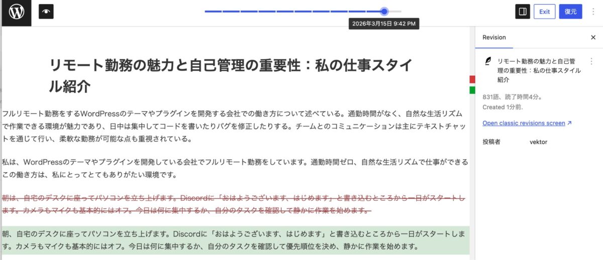 リビジョンが分かりやすくなります。これはいいですね!追加されたテキストは緑色、削除されたテキストは赤色、リンクや太字などの書式変更は黄色でハイライト表示され、差分が視覚的に表示されます。