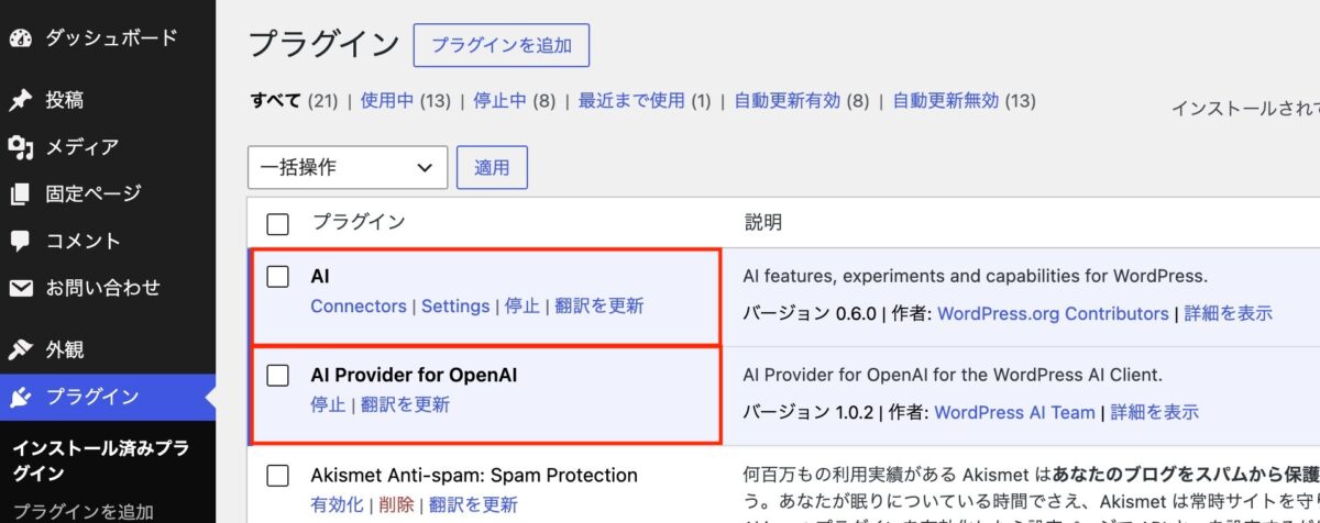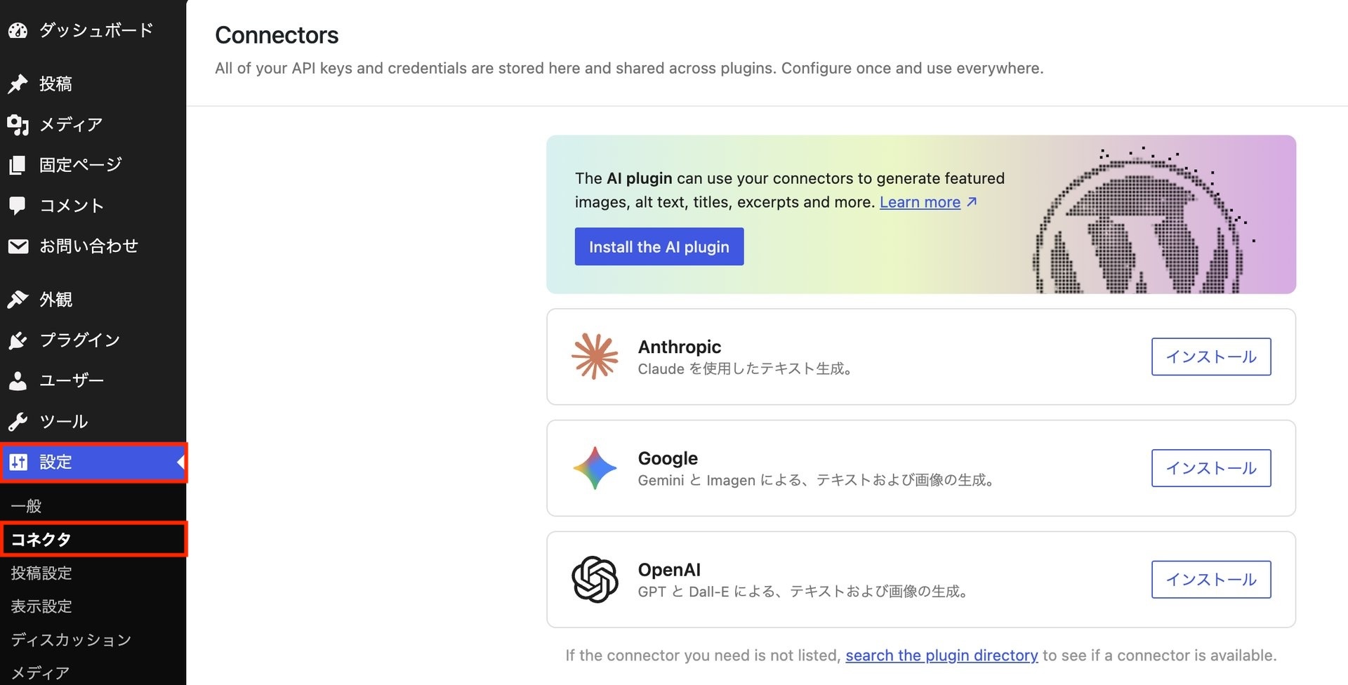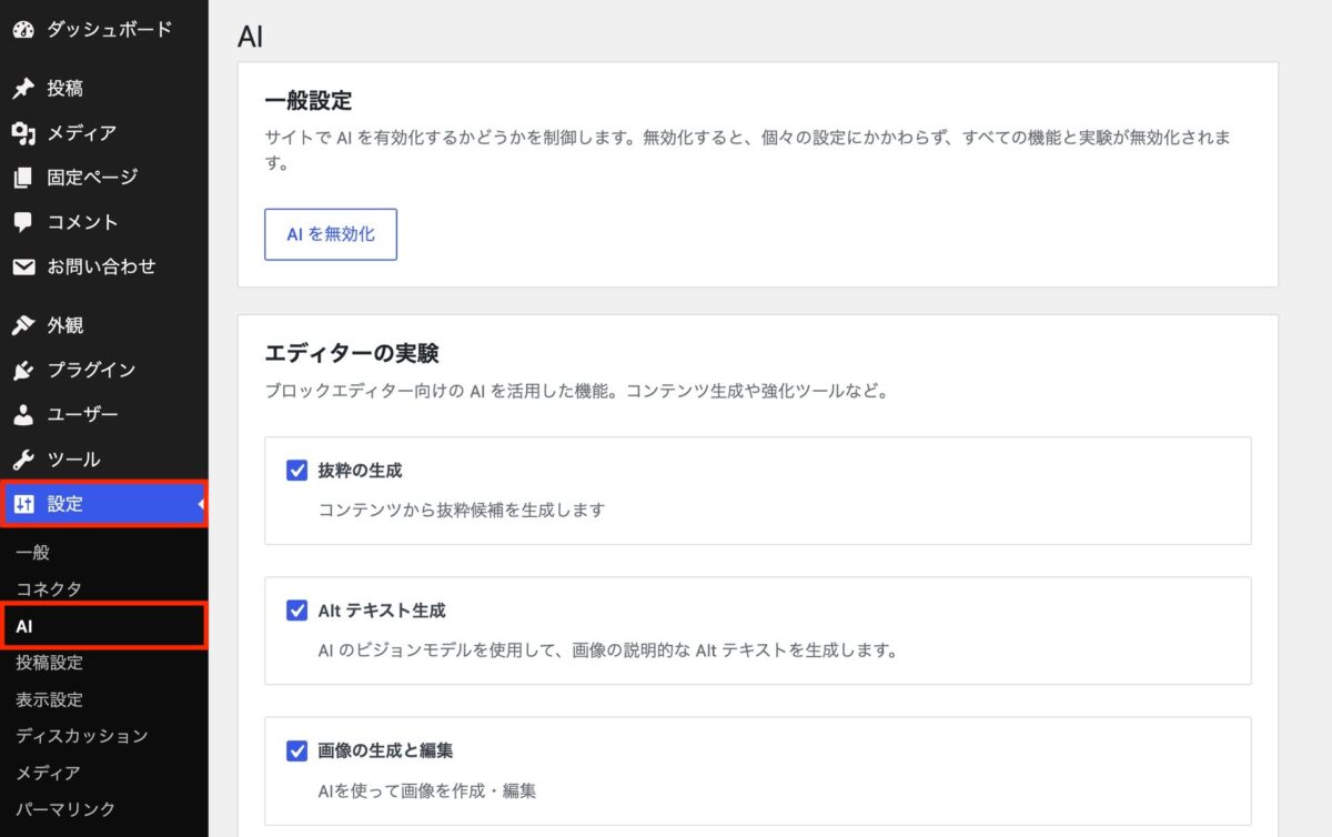 「設定」に外部AI接続を一元管理できる「コネクタ」が追加されています。ここから WordPress にAI機能を連携する「AI」プラグインのインストール・有効化が可能です。
