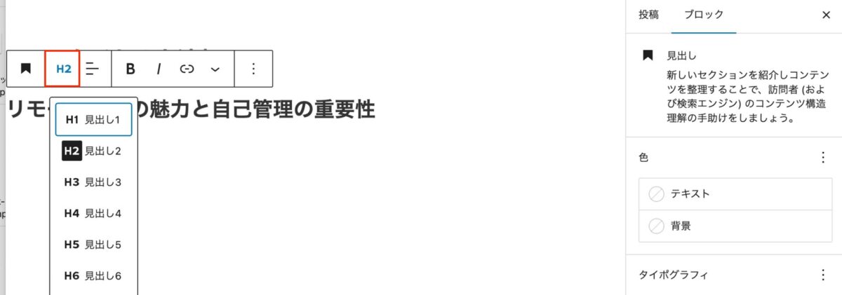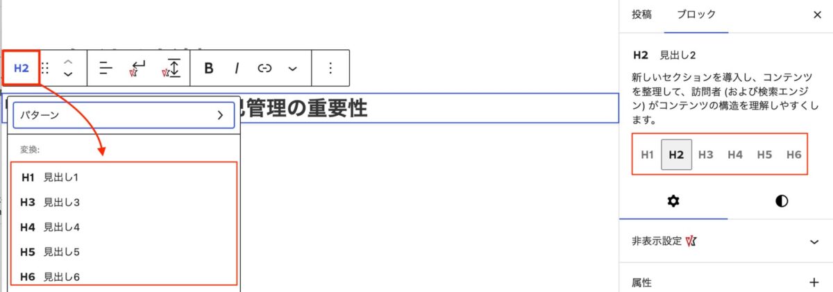ブロックツールバーの「H2」(クリックすると見出しレベルを変更できる)の位置が左端に変わっています。見出しレベルの変更はサイドバーの設定パネルでもできるようになります。
