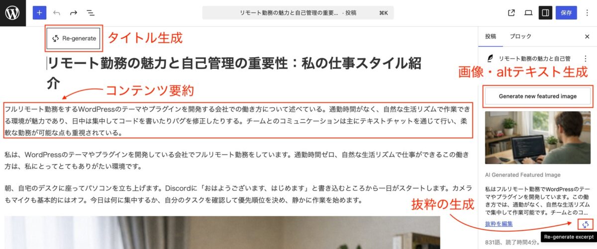 ベクトル製品には、コンテンツ生成を支援するAIプラグイン VK AI EditMate があります。ブロックエディターの編集画面上で、要約・抜粋の生成、画像の代替テキストの生成、複数記事の一括書き換えなどが簡単にできます。