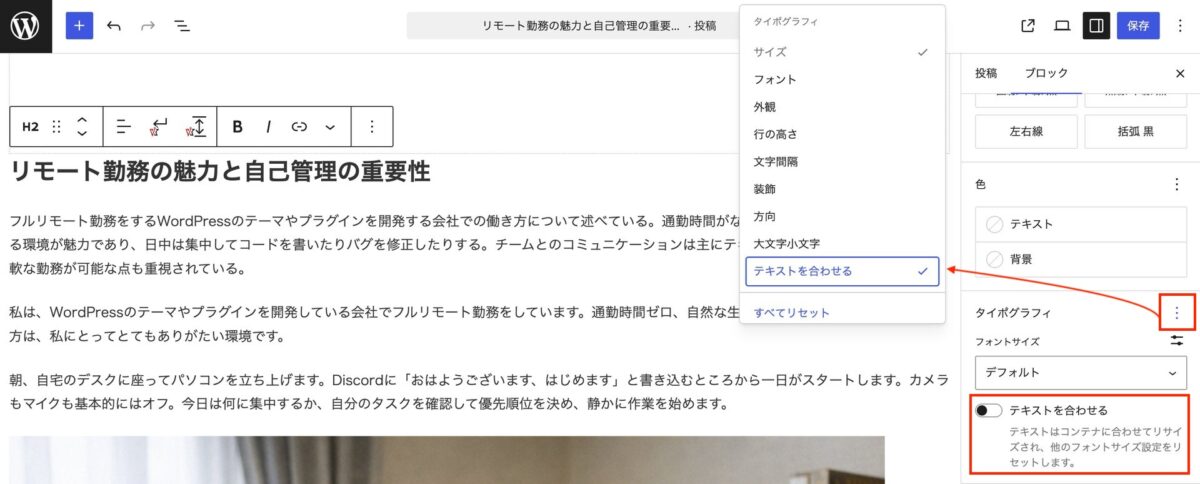 ちなみに、WordPress 6.9 で追加された「伸縮する見出し」ブロックは、見出しブロックのスタイルに変更され、「タイポグラフィ」に移動しています。「テキストを合わせる」をクリックすると設定パネルにオプションが表示されます。あわせて「伸縮する段落」ブロックも、段落ブロックのスタイルに変更されています。