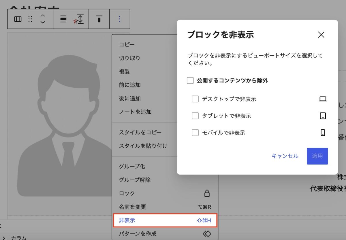 WordPress 6.9 で追加されたブロックの非表示機能で、デバイス(デスクトップ / タブレット / モバイル)を指定できるようになります。