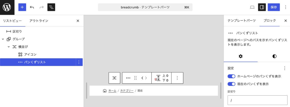 パンくずリストブロックは、ページや投稿カテゴリーなど、ページ階層のパンくずリストを簡単に配置できるブロックです。