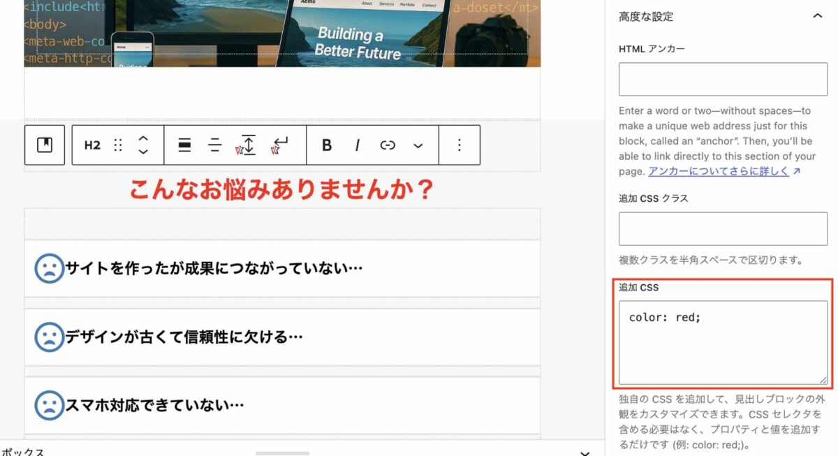 直接ブロックに対して手軽にCSSが書けるようになります。CSS セレクタを含める必要はなく、プロパティと値を追加します。