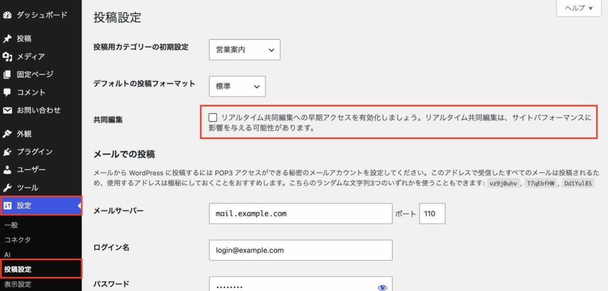 デフォルトではオフになっていますので、設定 > 投稿設定 で「共同編集」にチェックを入れて保存します。