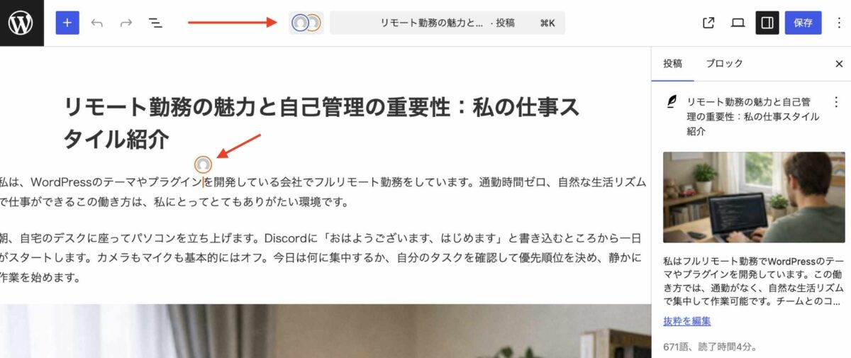 同じ投稿に複数のユーザーが参加すると、編集画面上部や編集中の箇所にアバターが表示されます。