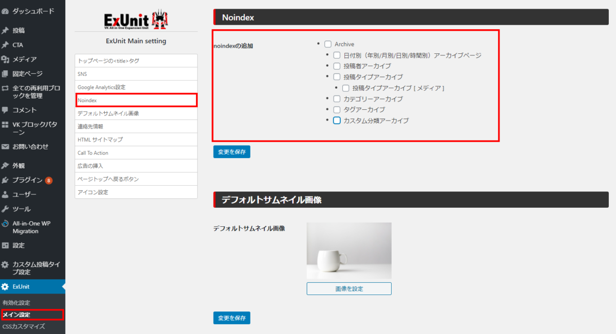 デフォルトではアーカイブページにnoindexタグは出力されません。【ExUnit】> ExUnitメイン設定画面から設定を行ってください。