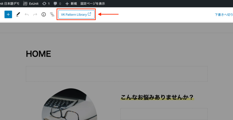 VK Block Patterns 1.16.1 で ヘッダーのツールバーへVKパターンライブラリへのリンクを追加しました。