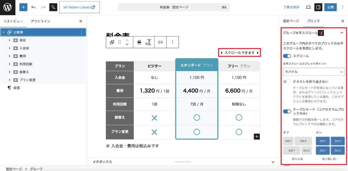 たとえば、カラムブロックで作成した料金表をスマホでも見やすくしたいときや、ギャラリーの画像をスマホで横スクロールで見せたいときなどに、ぜひご活用ください。