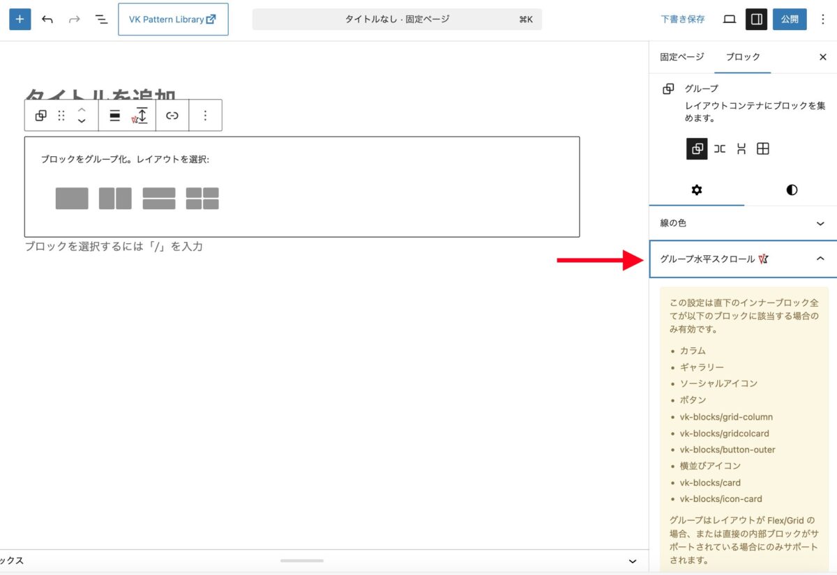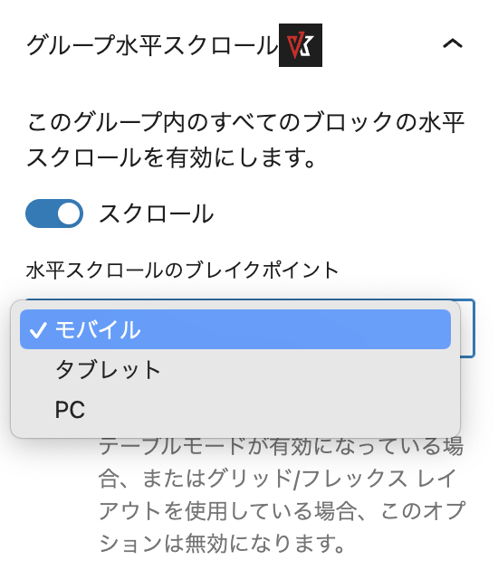 グループブロックを挿入すると、画面右の設定パネルに「グループ水平スクロール」が表示されます。