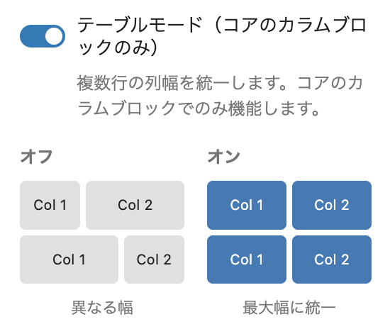 カラムブロックを配置したときのみ、テーブルモードを利用できます。有効にすることで複数行の列幅を統一します。