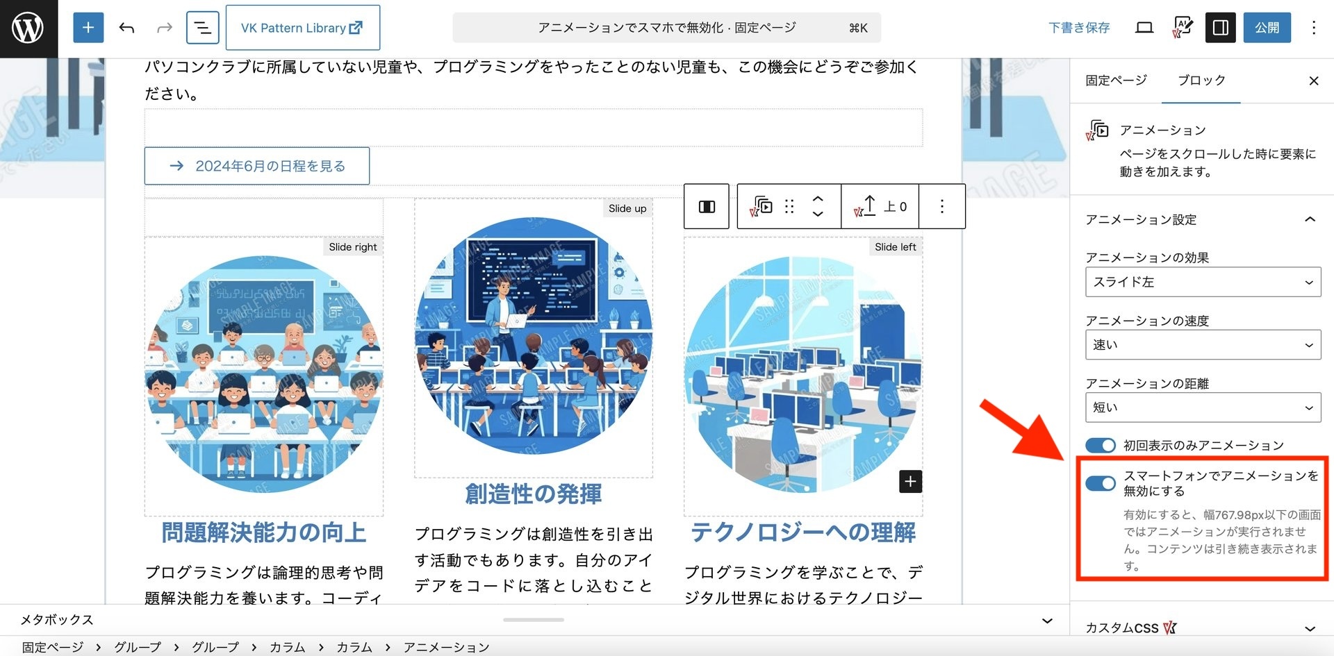 アニメーションブロックを設置すると、画面右側の設定パネルに「スマートフォンでアニメーションを無効化する」オプションが表示されます。このオプションをオンにすると、幅767.98px 以下の画面ではアニメーションが実行されません。