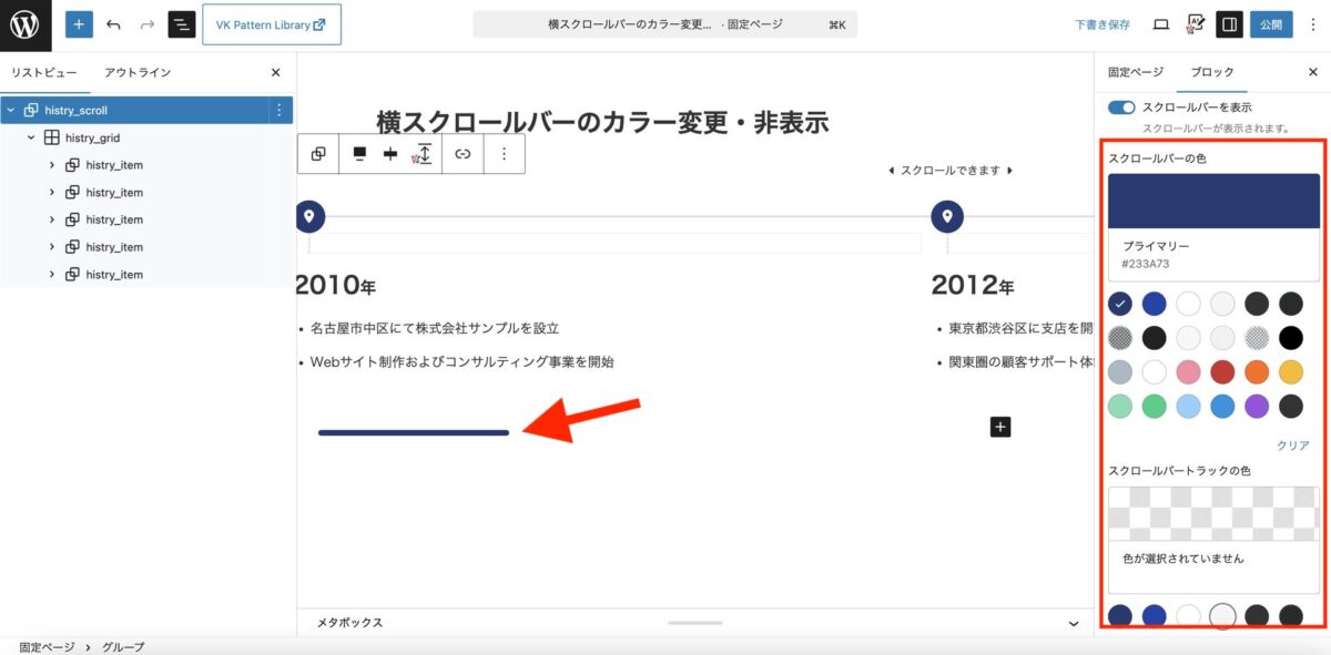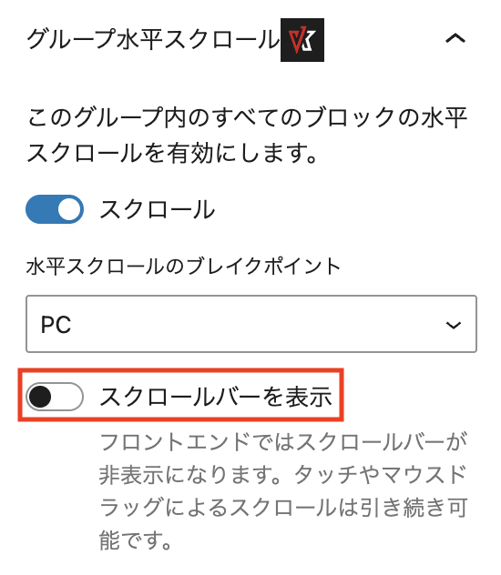 VK Blocks 1.117.0 では、VK Blocks の水平スクロール機能(タブ / グループ / テーブルブロック)に、スクロールバーのカラー変更と非表示の設定を追加しました。