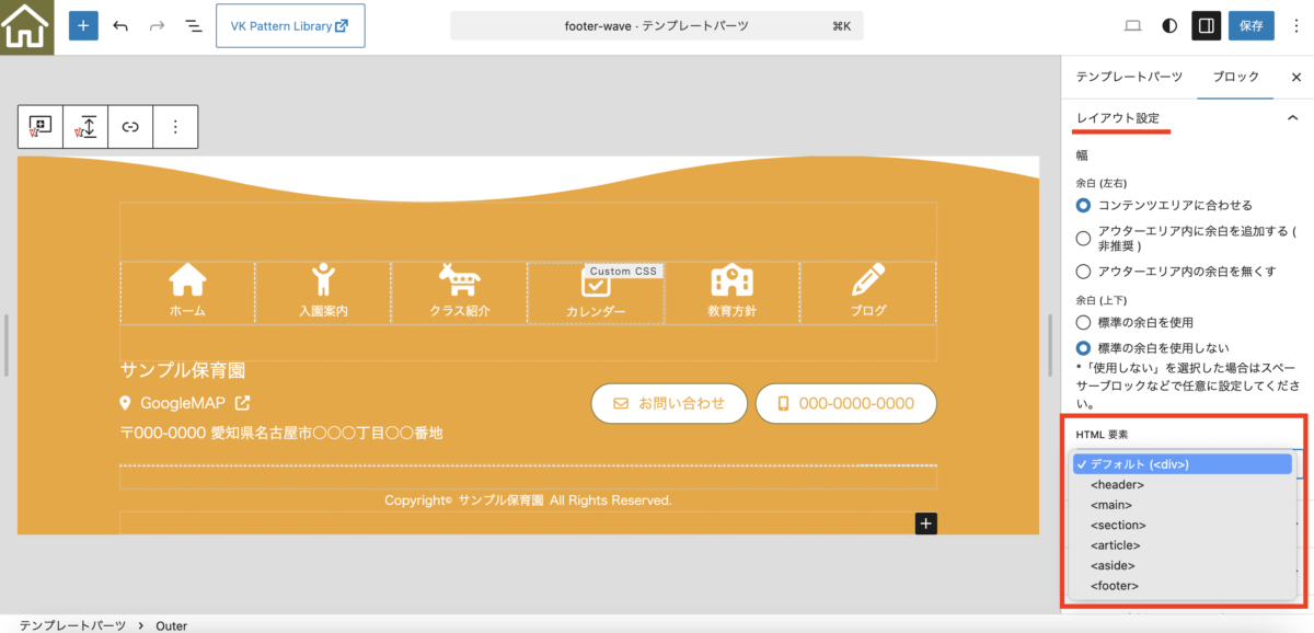 Outer ブロックはセクションレイアウトに利用するケースが多いと思います。今回の機能追加により、たとえば、フッターセクションを作る際には<footer>タグを選ぶといった使い方ができます。