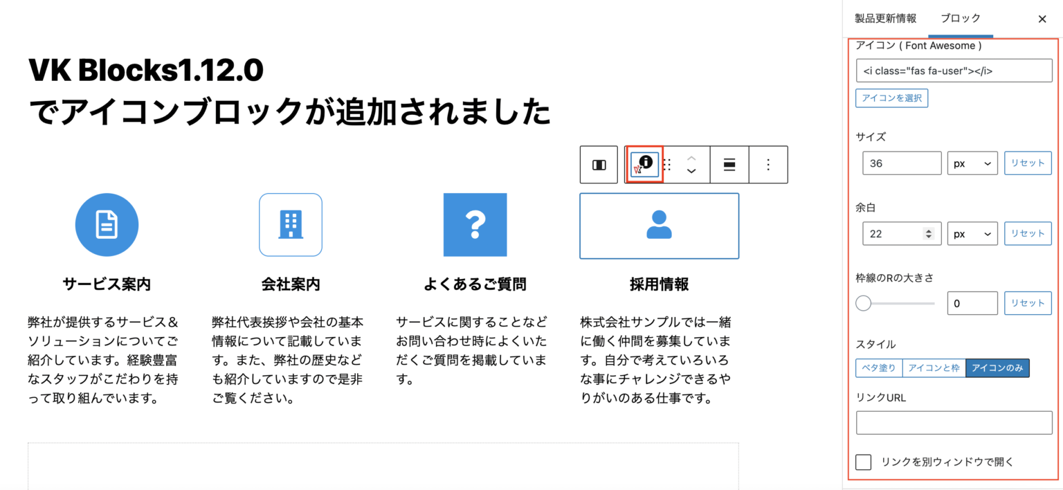 この記事は2年以上前に公開されたものです。最新の情報を参考にしてください。VK Blocks 1.12.0 でアイコンブロックを追加しました。アイコンブロックは、FontAwesome のアイコンを単体で配置できる便利な … 続きを読む VK Blocks1.12.0 でアイコンブロックが追加されました