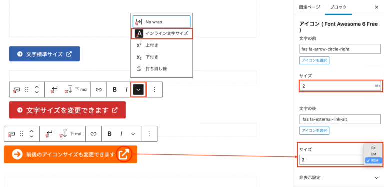 VK Blocks1.40.0 でボタンの文字サイズと前後のアイコンサイズを指定できるようになりました。