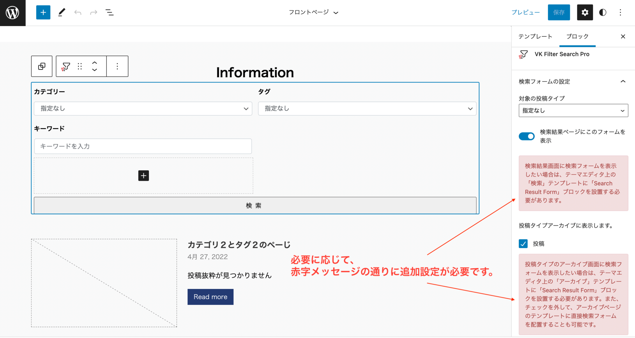 VK Filter Search 1.9.0 でFSEに対応したブロックテーマでご利用いただけるようになりました。必要に応じて、追加の設定が必要になります。赤字のアラートメッセージに従って設定してください。