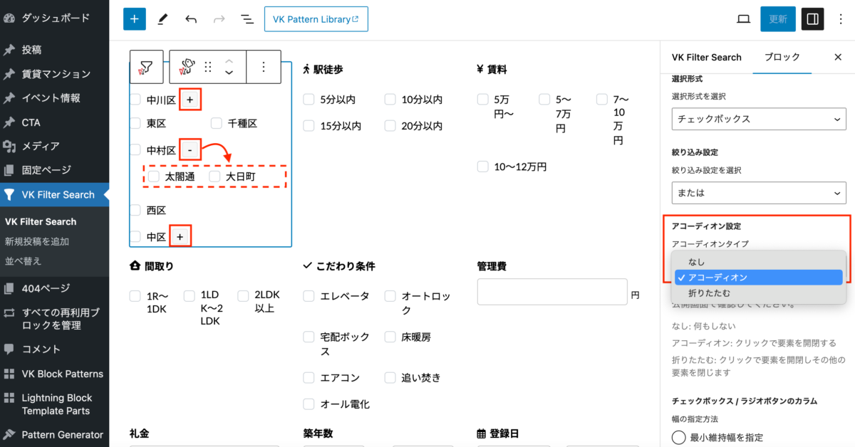 なお、VK Taxonomy Search Pro ブロックには、アコーディオン設定も追加しています。ぜひ合わせてお試しください。