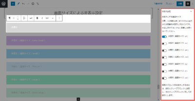 画面サイズ毎にブロックを非表示にすることができます。PCでは表示し、スマートフォンでは表示しないなどの制御が可能です。