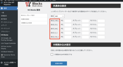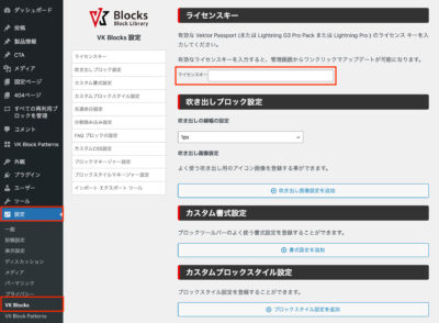 管理画面【設定】 > 【VK Blocks】で行える VK Blocks / Pro の各設定の一覧です。