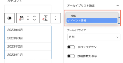 アーカイブリストブロックは投稿タイプを指定できるブロックです。カスタム投稿を選んで一覧表示が可能です。