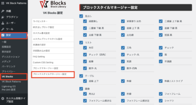 VK Blocksの追加スタイルであまり使わないものを設定サイドバーのパネルで非表示にすることができます。