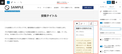 投稿リストブロックと同じレイアウトで表示するページを任意に指定する事ができます。