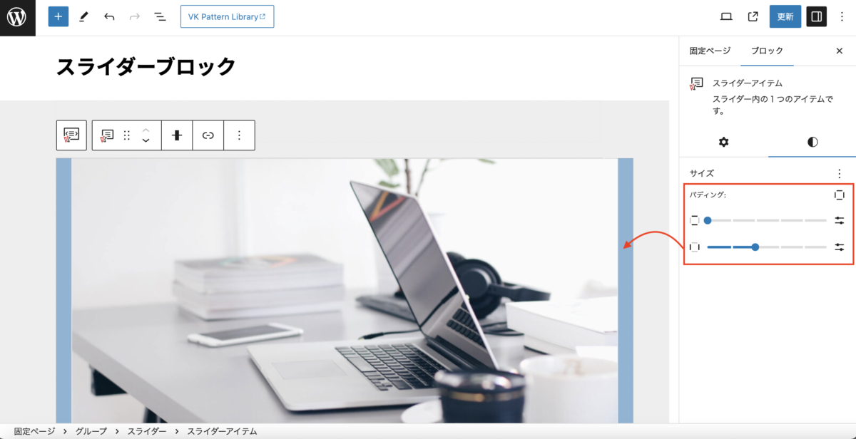スライダーアイテムのスタイルから、パディングを指定できます。